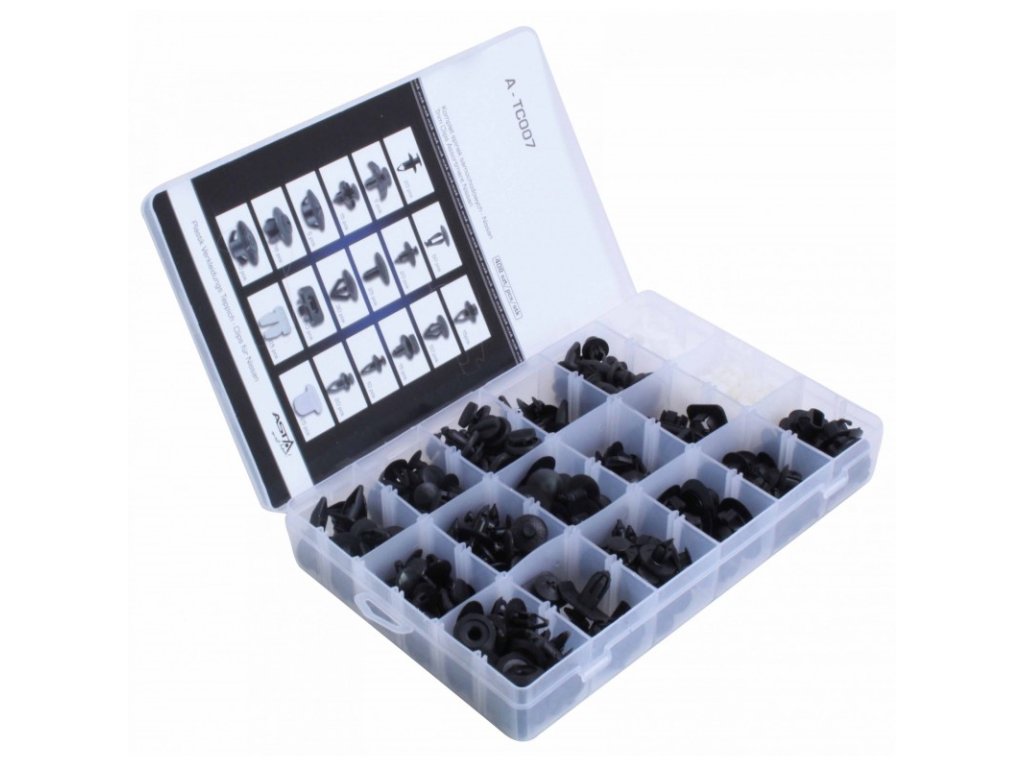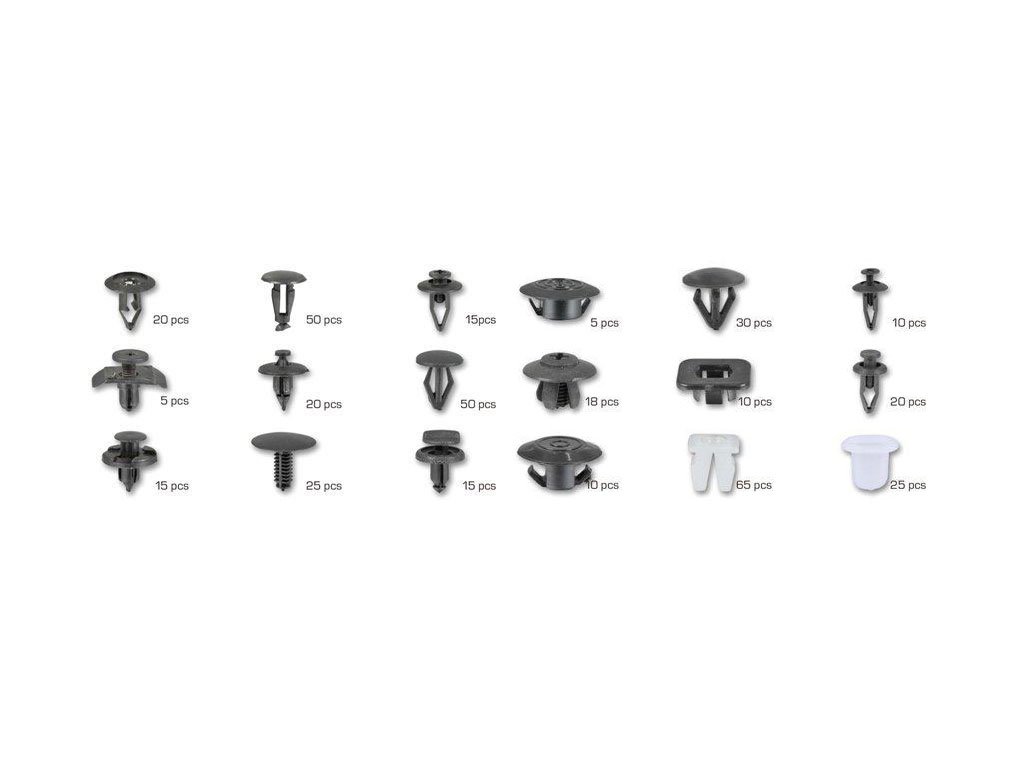 Sada nejpoužívanějších příchytek / cvočků pro čalounění a plastové díly vozů Nissan. 18 různých druhů, celkem 408 ks.