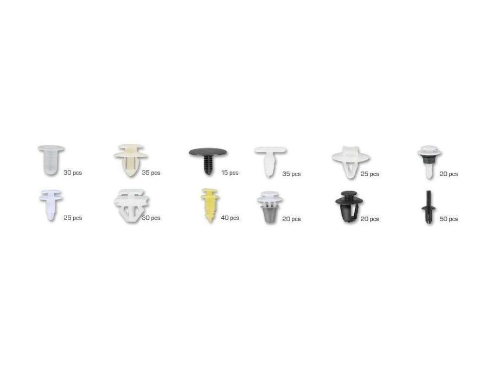 Sada nejpoužívanějších příchytek / cvočků pro čalounění a plastové díly vozů Peugeot. 12 různých druhů, celkem 345 ks.