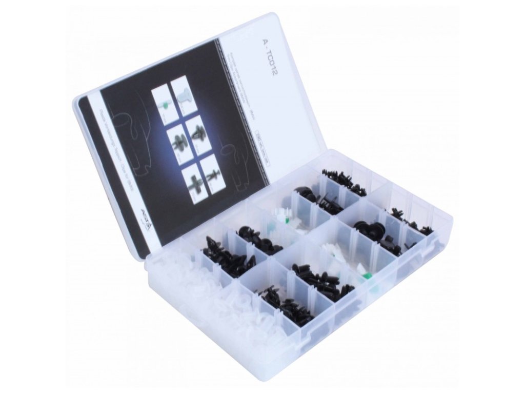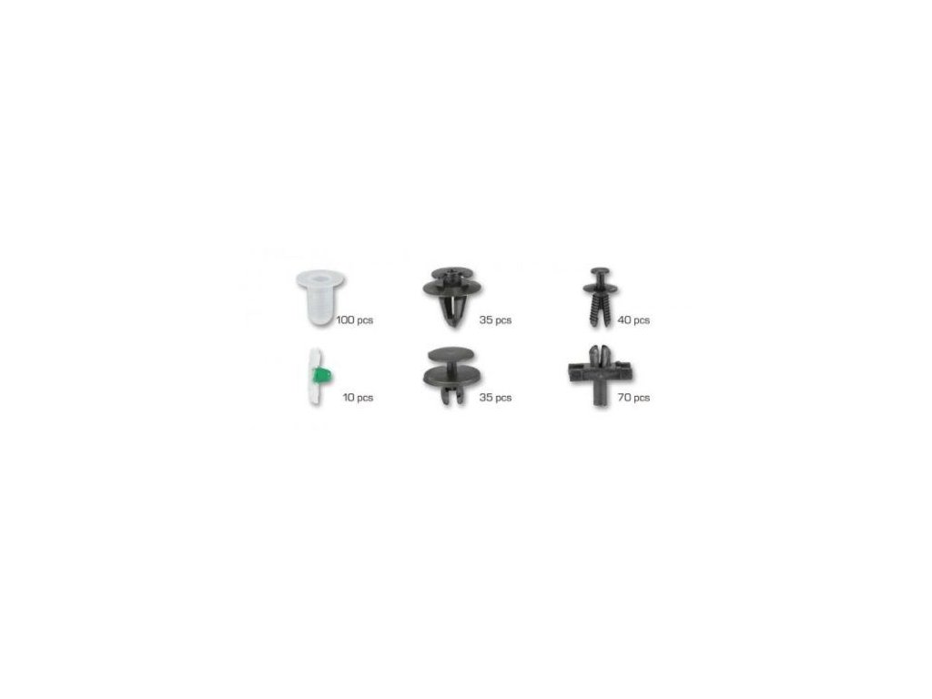 Sada nejpoužívanějších příchytek / cvočků pro čalounění a plastové díly vozů BMW. 6 různých druhů, celkem 290 ks.
