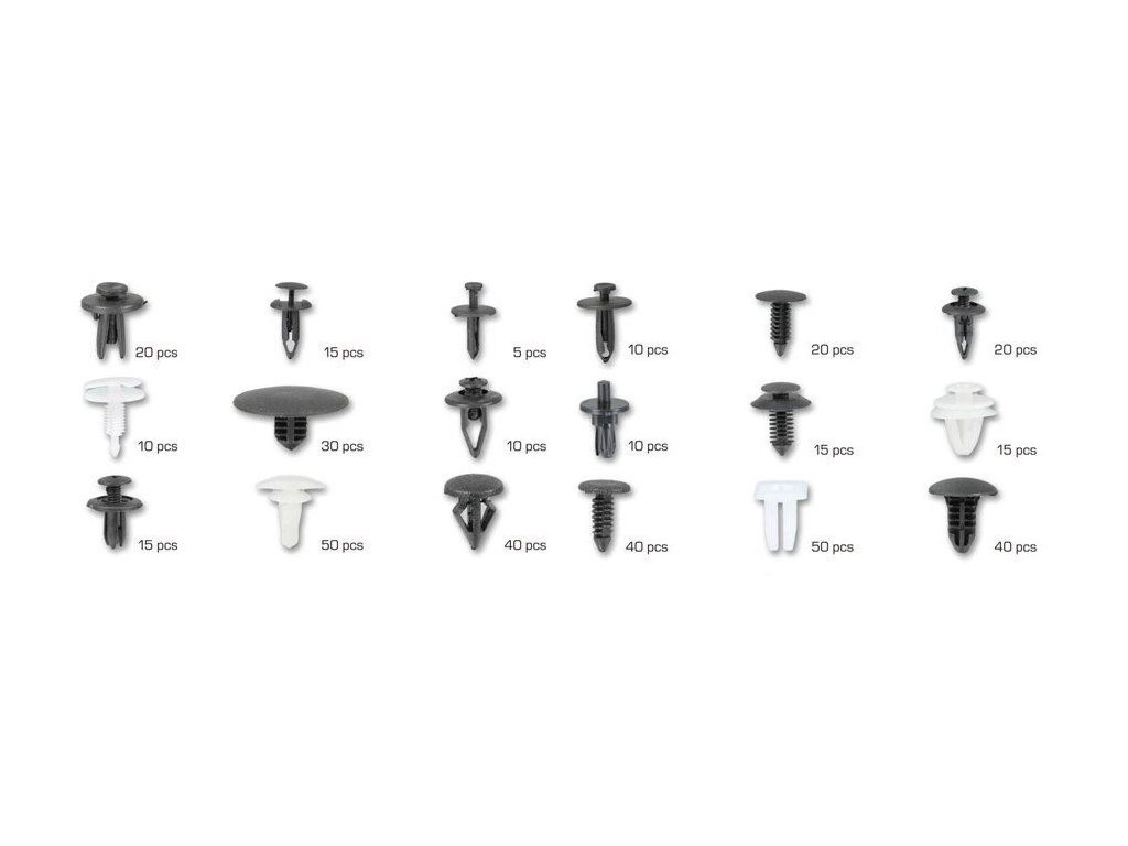 Sada nejpoužívanějších příchytek / cvočků pro čalounění a plastové díly vozů Ford. 18 různých druhů, celkem 415 ks.