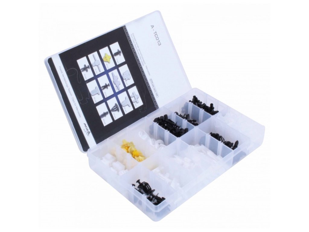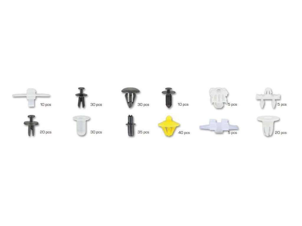 Sada nejpoužívanějších příchytek / cvočků pro čalounění a plastové díly vozů Mercedes-Benz. 12 různých druhů, celkem 270 ks.