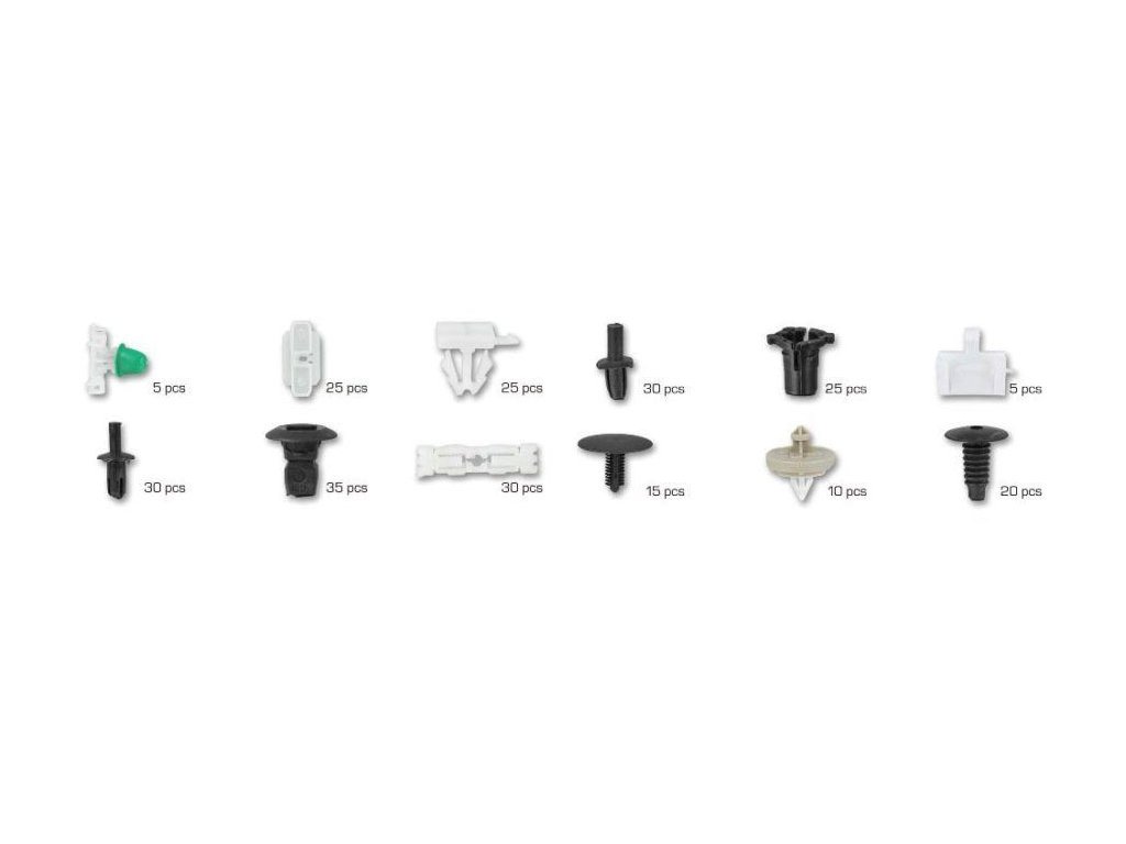 Sada nejpoužívanějších příchytek / cvočků pro čalounění a plastové díly vozů Volkswagen. 12 různých druhů, celkem 255 ks.