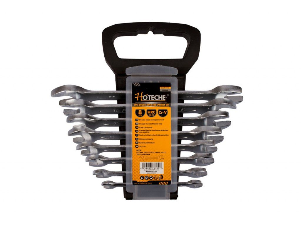 Ploché klíče v sadě 8 ks, která je přehledně uložena v plastovém držáku. Díky držáku je pak sada úspornější na skladovací prostor a hodí se jak na cesty, tak na montáže. Klíče jsou vyrobeny z kvalitní chrom-vanadiové oceli s tvrdostí HRC40-48.