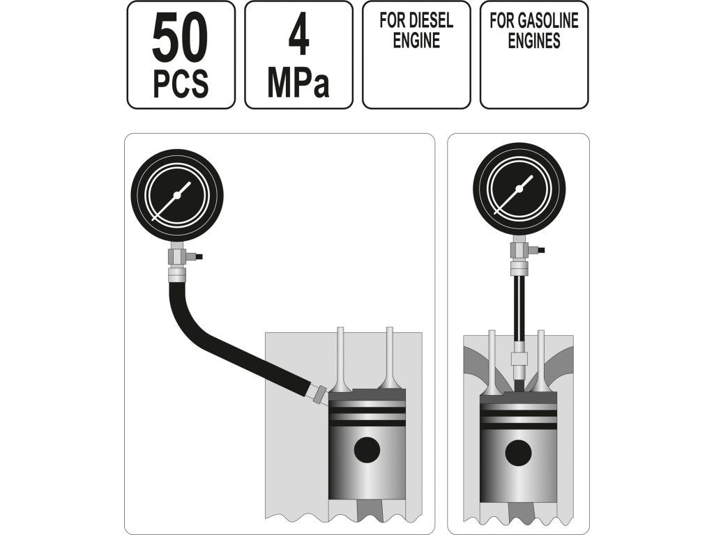 Určeno pro osobní automobily, dodávky, autobusy, traktory, zemědělská vozidla a dokonce i motorové čluny. Měření lze provádět v prostoru svíček případně vstřikovačů.