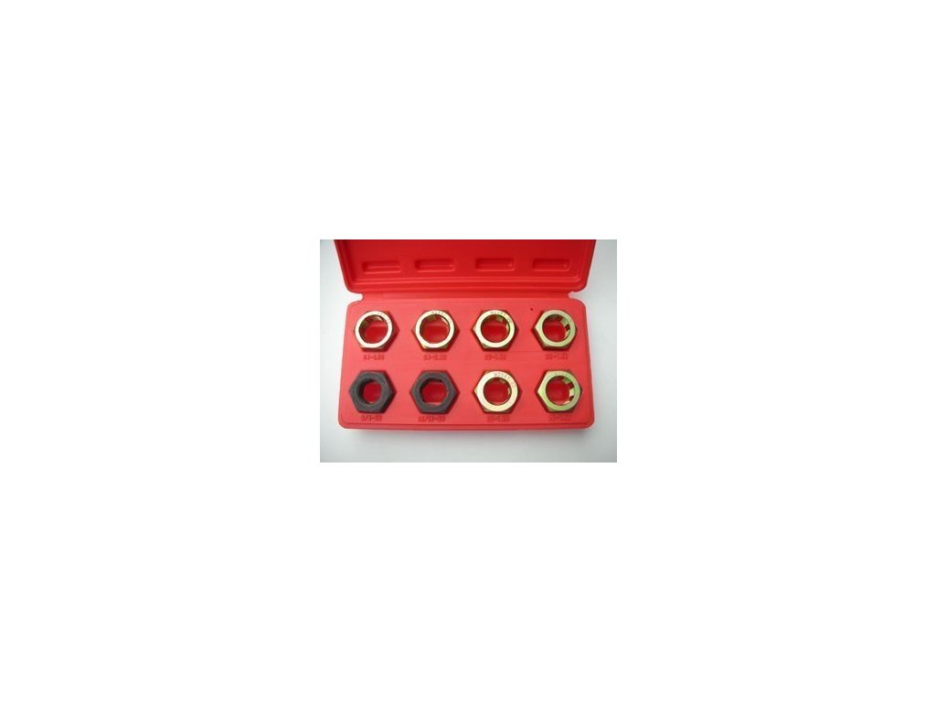 - 8 dílný set pro opravu poškozených závitů hřídelí kol automobilu z kvalitního materiálu.