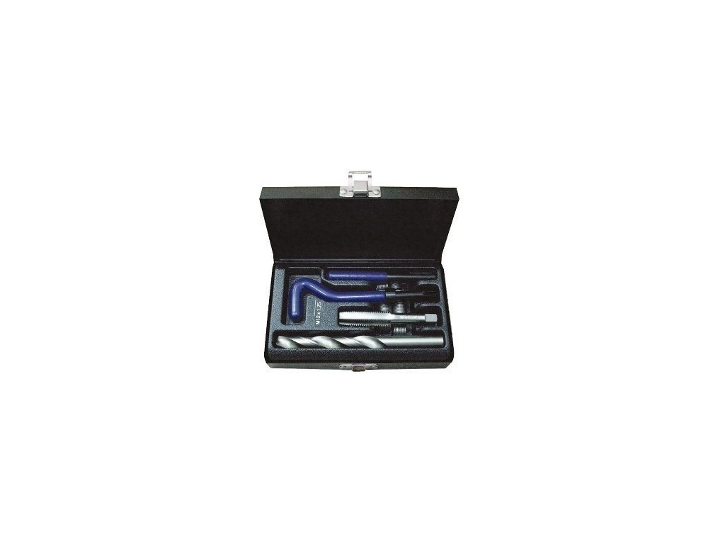 Sada na opravu závitů M14, 9 kusů, obsahuje vrták HSS, šroubový čep, rozrážecí a instalační přípravek, klíč imbus a 10 vložek závitu, dodáváno v plechové krabičce.