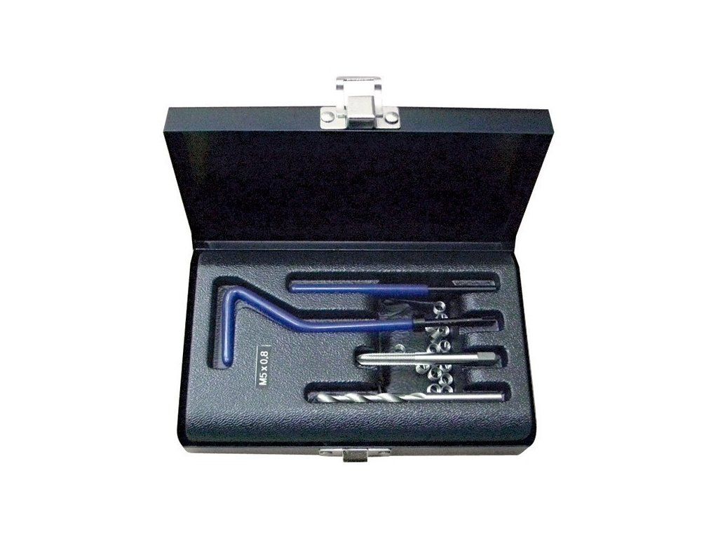 Sada na opravu závitů ve variantě M5, vždy 25 kusů, obsahuje vrták HSS, šroubový čep, rozrážecí a instalační přípravek, klíč imbus a 20 vložek závitu, dodáváno v plechové krabičce.