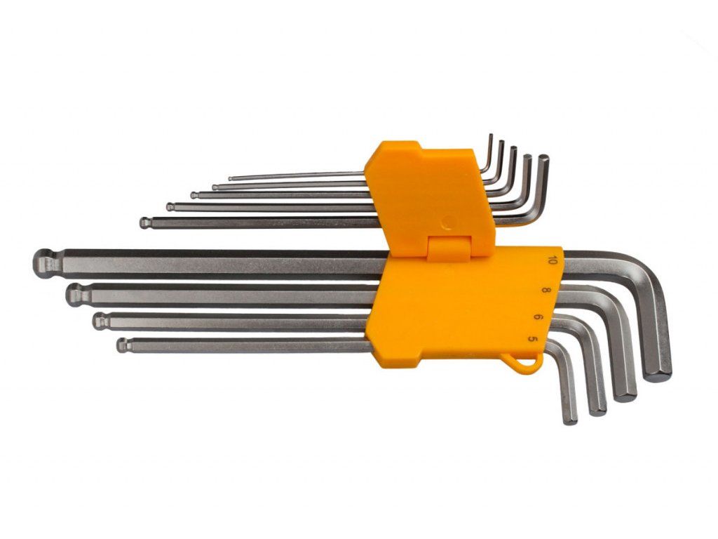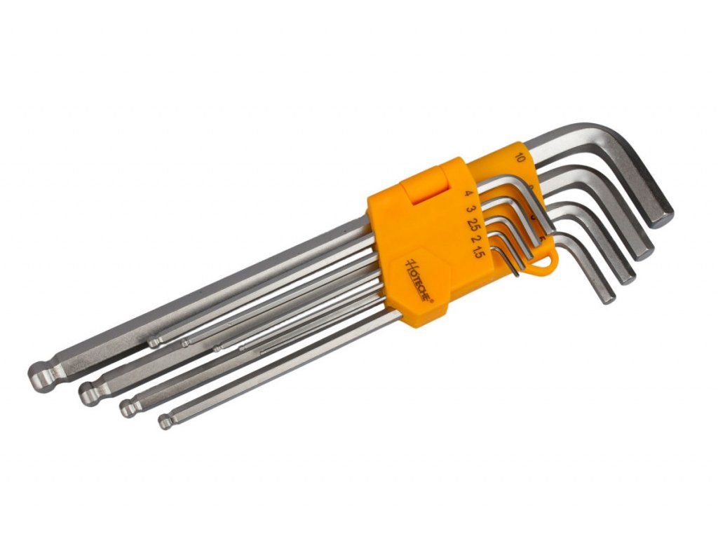 Sada prodloužených imbus klíčů s kuličkou je uložena v plastovém držáku s očkem pro zavěšení. V sadě naleznete 9 kusů HEX klíčů o velikosti 1,5; 2; 2,5; 3; 4; 5; 6; 8 a 10 mm.