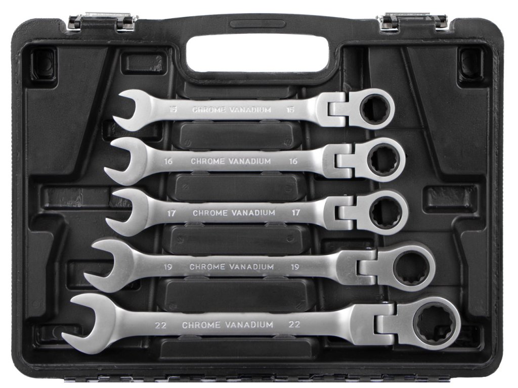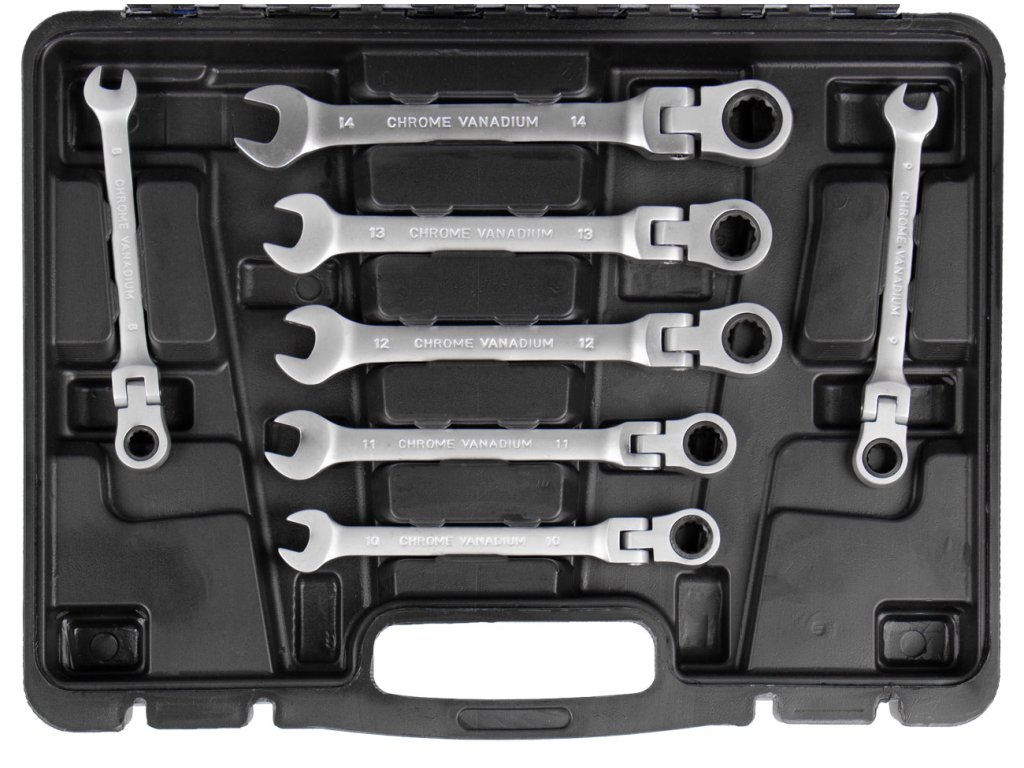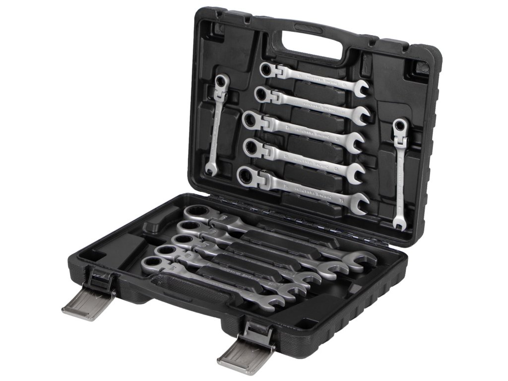 - Sada 12 ks očkoplochých ráčnových flexibilních klíčů o velikosti 8, 9, 10, 11, 12, 13, 14, 15, 16, 17, 19 a 22 mm.