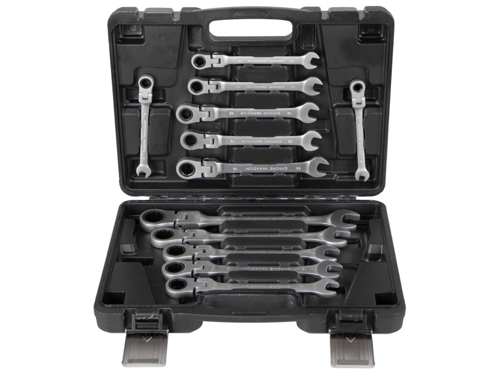 Sada 12 ks očkoplochých ráčnových flexibilních klíčů uložených v praktickém kufru o velikosti 8 až 22 mm.