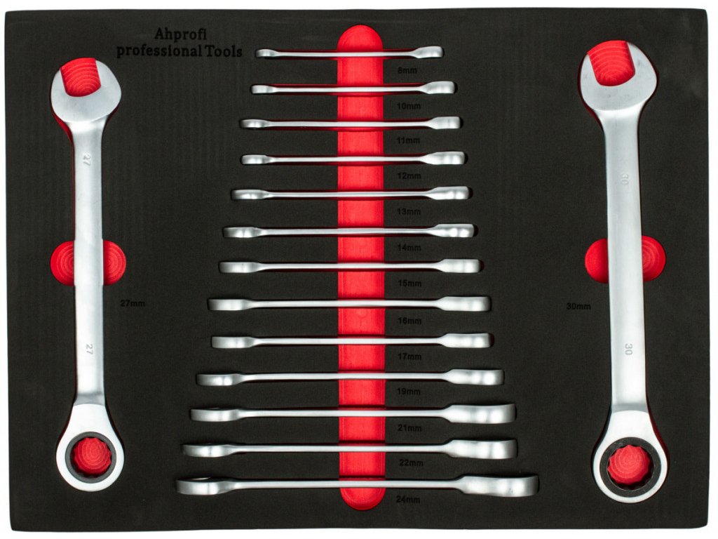 Pěnová vložka o rozměrech 53 x 39 cm. Výplň obsahuje sadu řáčnových očkoplochých klíčů o velikostech 8 - 30 mm.