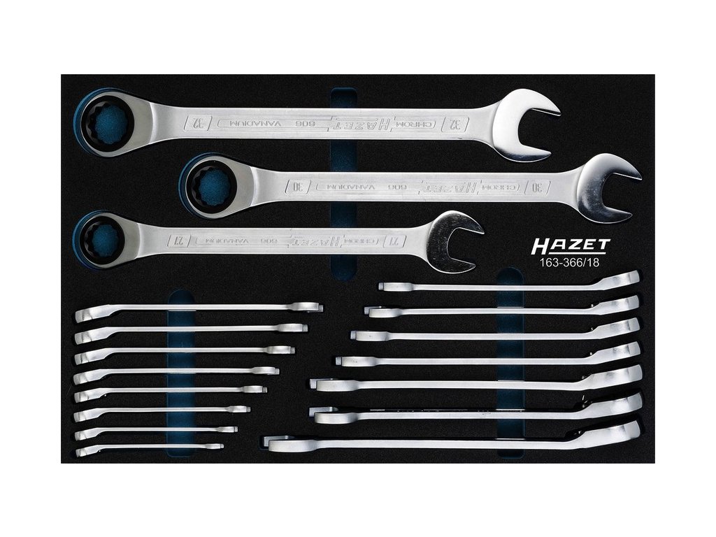 Sada klíčů, kvalitní německý výrobce HAZET, celkem 18 kusů v pěnové vložce, vhodná pro dílenské vozíky, obsahuje ráčnové očkoploché klíče 8 - 32 mm.