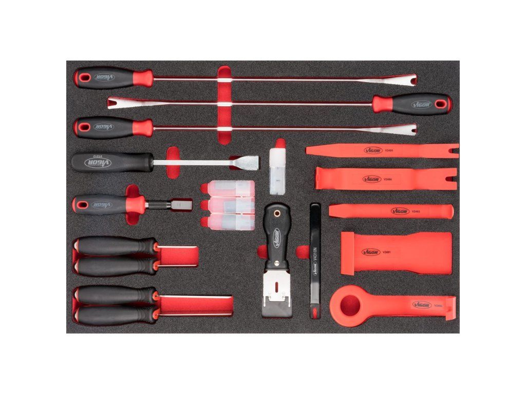 41 kusů nářadí v sadě škrabek a uvolňovacích pák ve výplni do dílenského vozíku. Snadno omyvatelná vložka z 2K měkké pěny, odolná vůči olejům a tukům. Rozměr 563 x 393 x 35 mm.