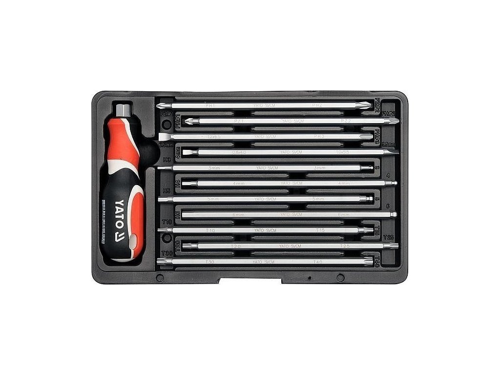 Šroubovák s vyměnitelnými bity, sada 12 kusů - Rukojeť z tříbarevného měkčeného plastu s protiskluzovou vrstvou umožňuje aplikovat oboustranné bity z kvalitní slitiny oceli SVCM dlouhé 175 mm.