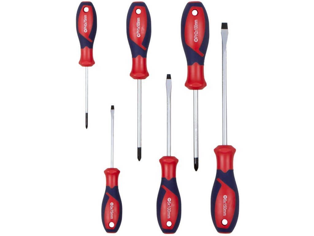 3 ploché a 3 křížové šroubováky v sadě, velikosti SL 3×75 mm, 5×100 mm, 6×150 mm, velikosti PH 0×75 mm, 1×100 mm, 2×100 mm. Chrom-vanadová ocel, magnetické mořené hroty, ergonomické rukojeti.