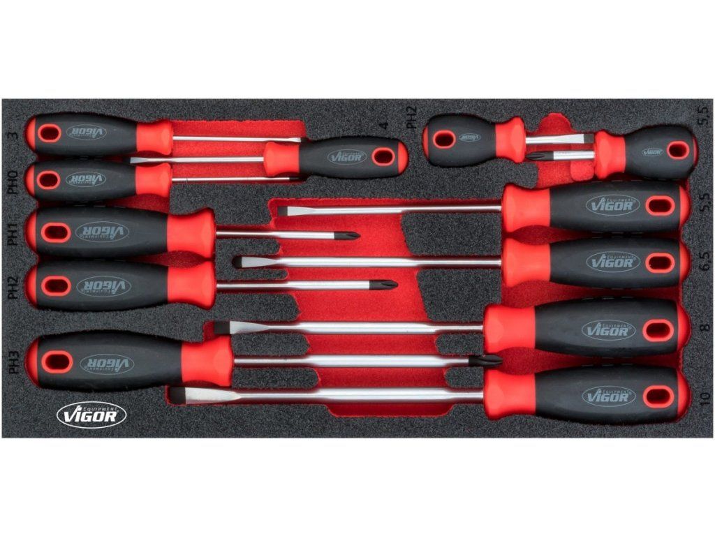 Sada šroubováků je určená pro přehledné uložení v dílenských vozících a každodenní použití v profesionálních i servisních provozech.