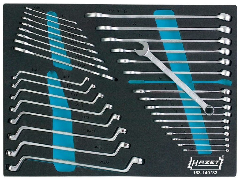 Sada kvalitních klíčů od německé značky HAZET v pěnové vložce do zásuvek vozíků, obsahuje celkem 33 kusů plochých, očkových a očkoplochých klíčů.