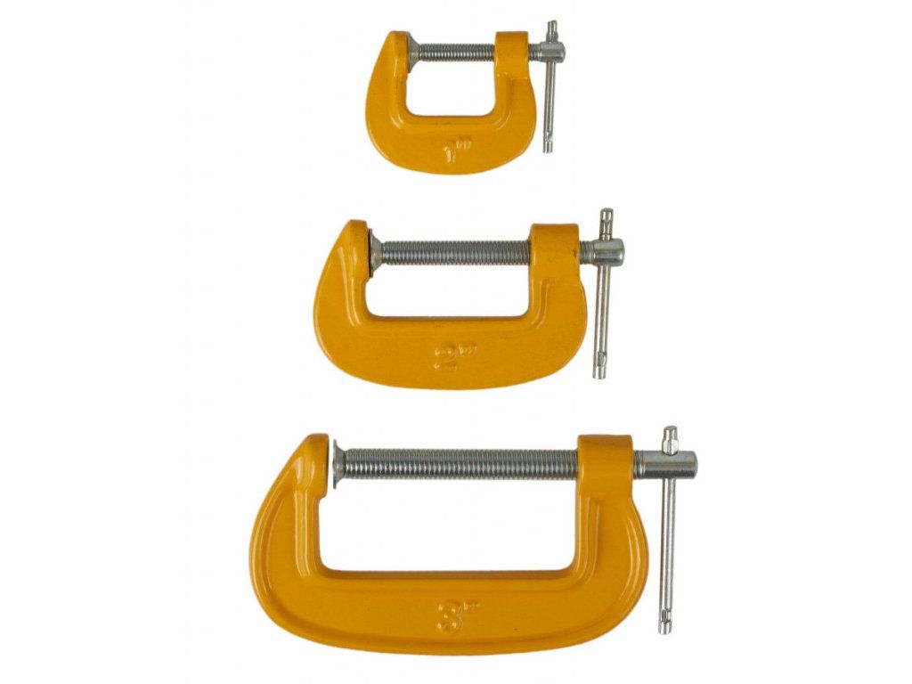 Sada svěrek typu C, 3 ks. Velikosti: 25 mm, 50 mm a 75 mm.