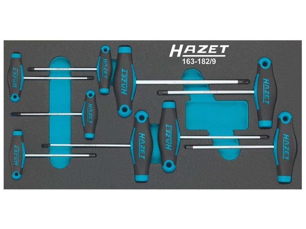 Sada kvalitních T-šroubováků TORX od výrobce HAZET, 9 kusů v pěnové vložce, ideální do zásuvek pojízdných skříněk, velikost hvězdičky T6 až T30.