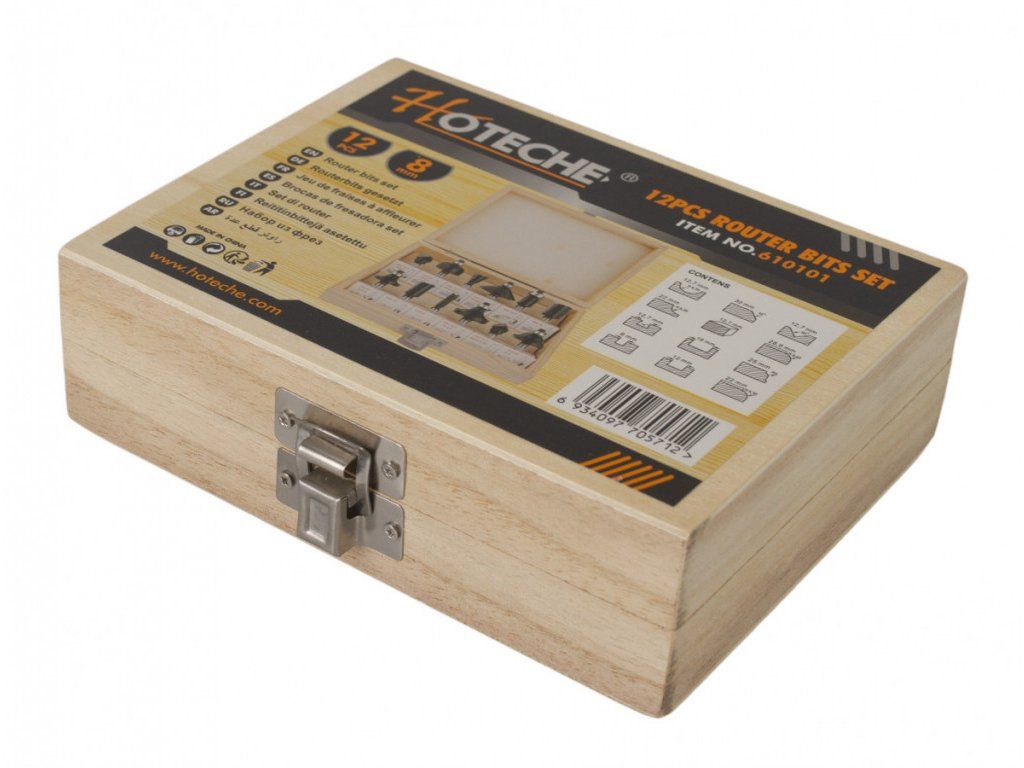 Sada tvarových fréz do dřeva, 12 ks ve dřevěné krabičce. Průměr stopky 8 mm.