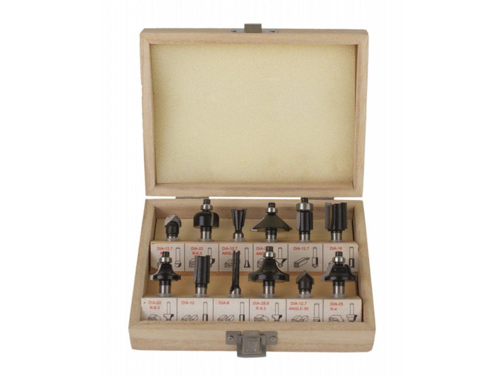 Sada 12ti kvalitních tvarových fréz do dřeva s průměrem stopky 8mm, která příjde vhod každému pracovníkovy s frézkou.