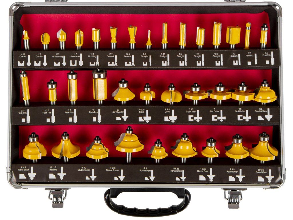 Sada 35 ks kvalitních tvarových fréz do dřeva s průměrem stopky 8 mm, která přijde vhod každému pracovníkovy s frézkou.