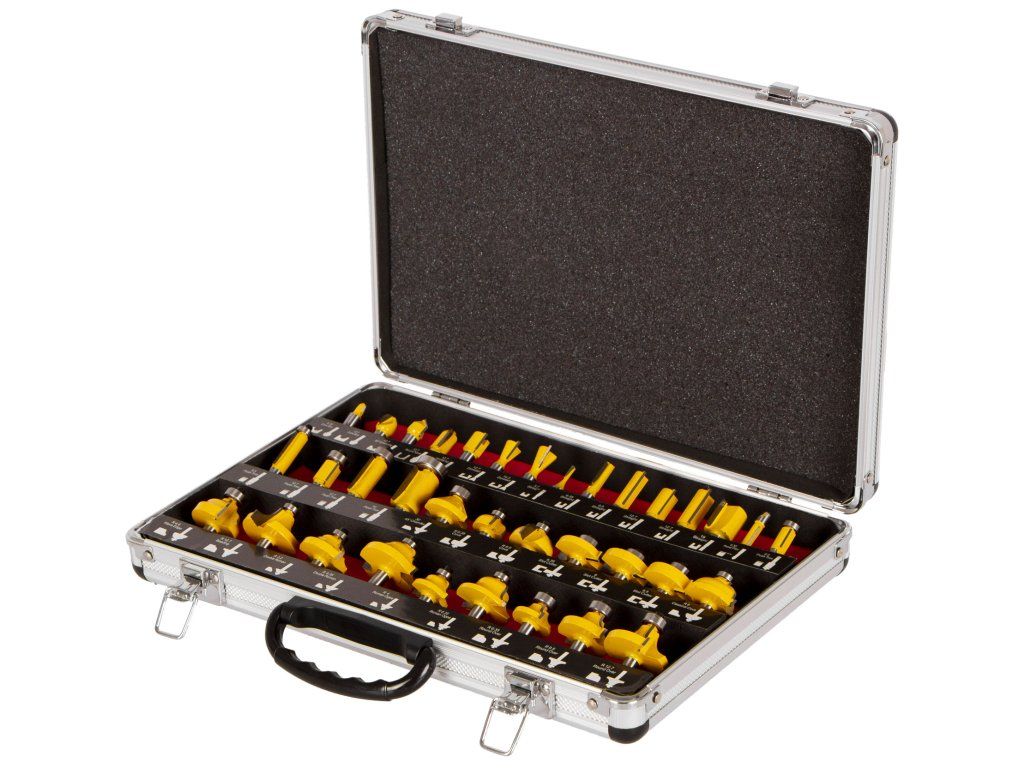 Sada tvarových fréz do dřeva, 35 ks v hliníkovém kufru. Průměr stopky 8 mm.