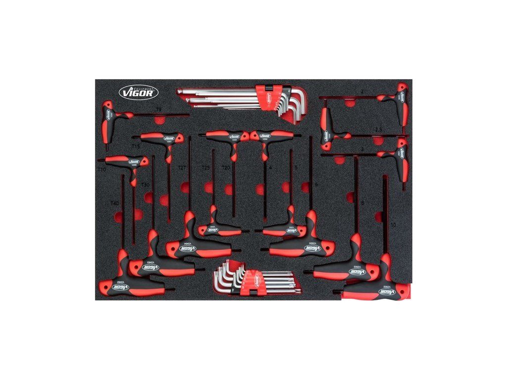 Sada kvalitních šroubováků IMBUS a TORX (sada úhlových šroubováků a T-šroubováků) od výrobce VIGOR, 34 kusů v pěnové vložce, ideální do zásuvek pojízdných skříněk.