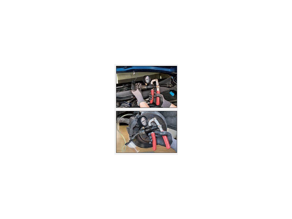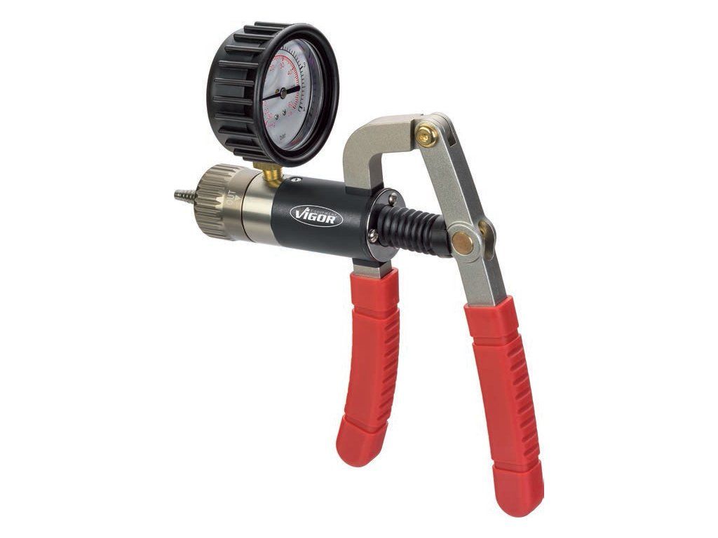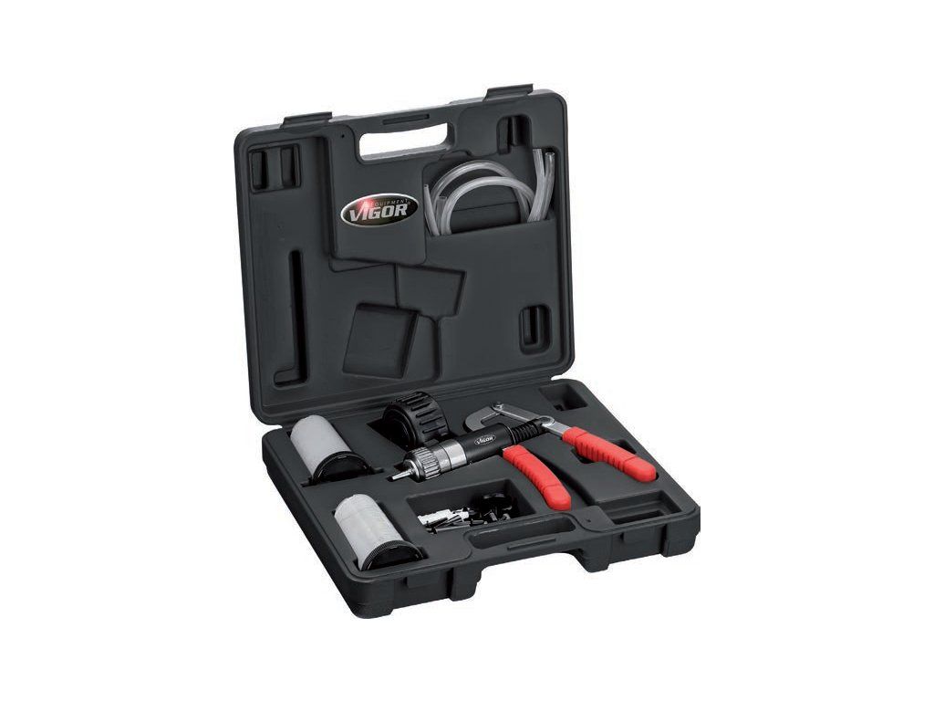 Sada vakuové a tlakové pumpy VIGOR, ke kontrole tlakových a podtlakových soustav, včetně sortimentu adaptérů.