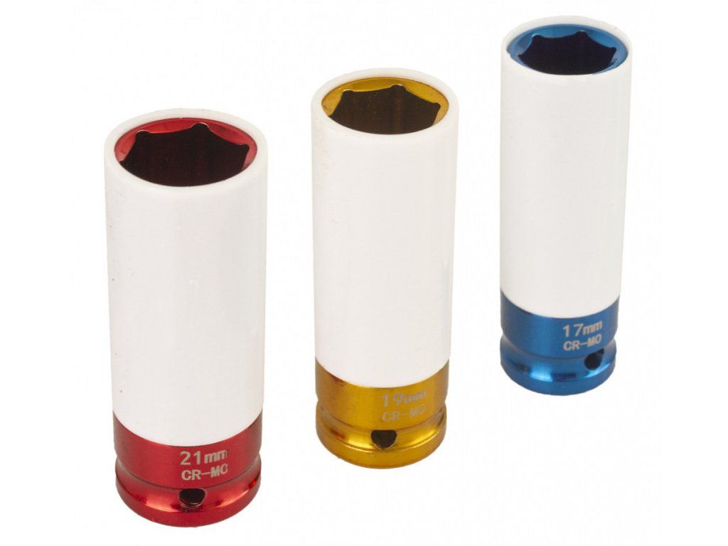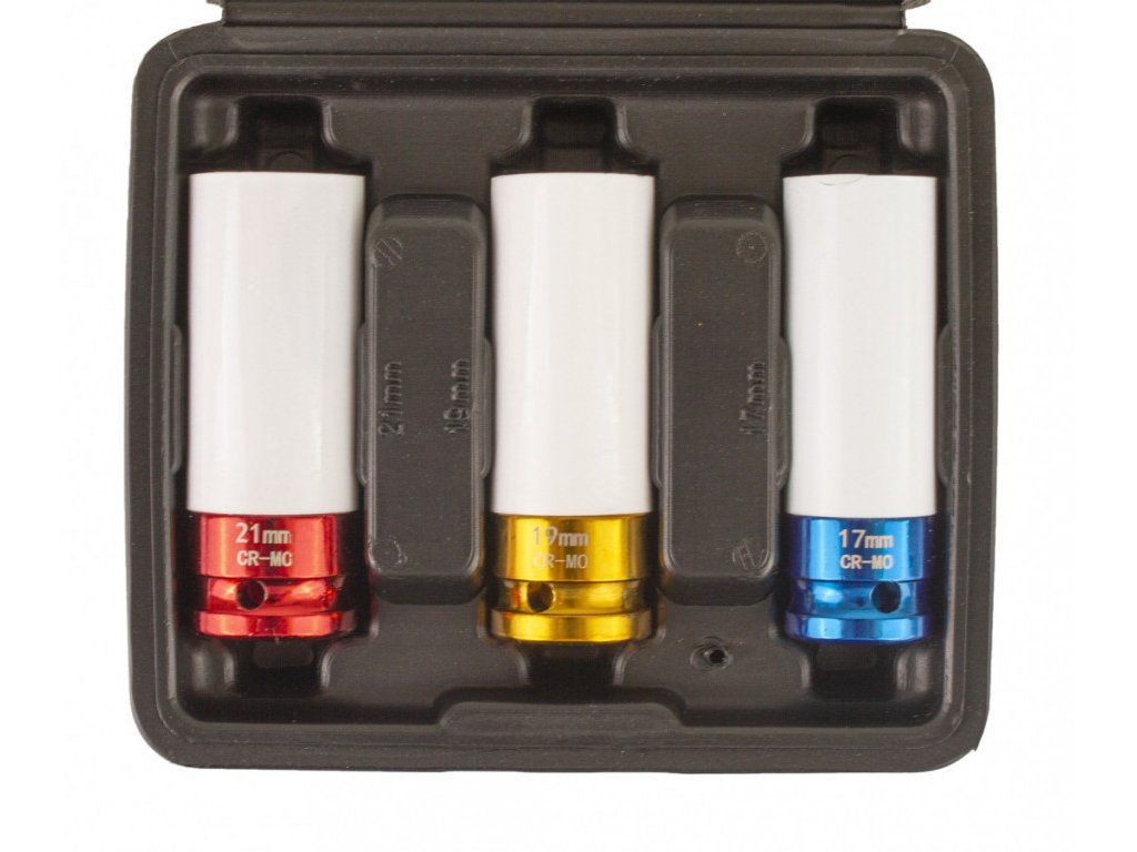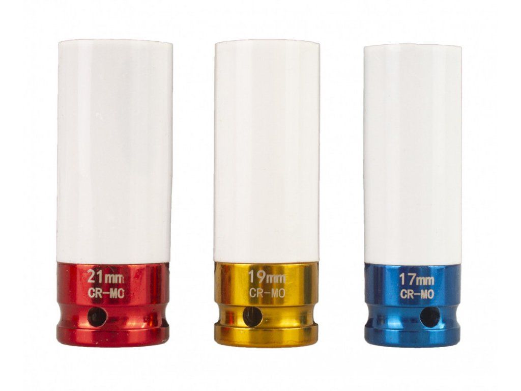Sada obsahuje 3 ks klíčů o velikostech 17 mm (modrá), 19 mm (zlatá), 21 mm (červená) a délce 80 mm.
