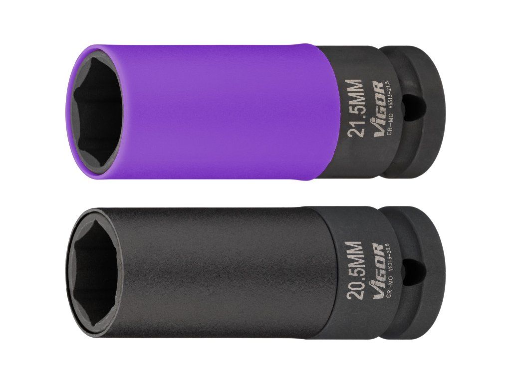 Kované vnitřní nástrčné klíče, čtyřhran 1/2", vnější šestihran, délka 80 mm. Speciální velikosti 20,5 mm a 21,5 mm, vyrobeno z Cr-Mo oceli. Sada 2 kusy, barevné odlišení.