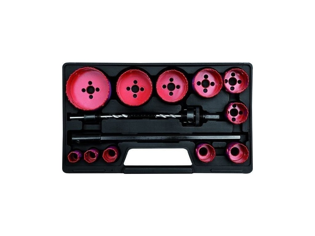 Praktická sada 15 ks vrtacích korunek s unašeči s kulatou stopkou a Hex zakončením.