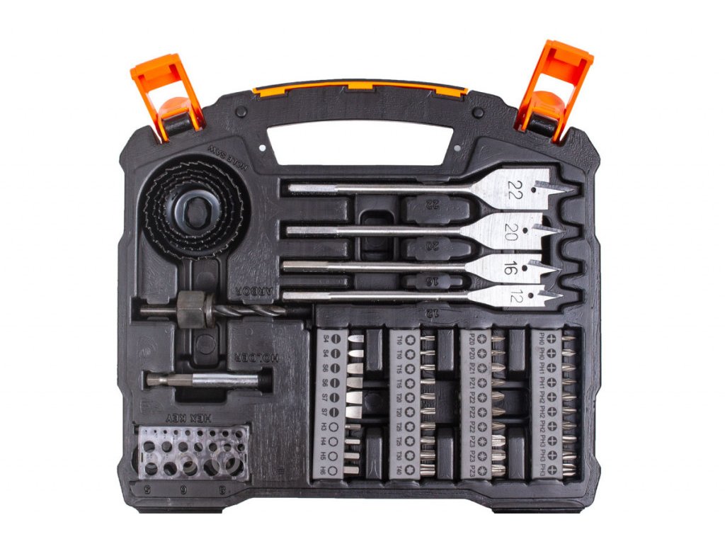 Sada obsahující různé druhy vrtáků, bitů, nástrčných klíčů apod. Plastový kufr 260 x 230 x 70 mm.