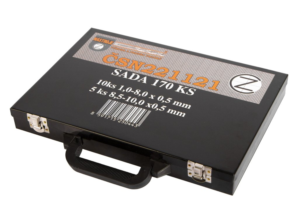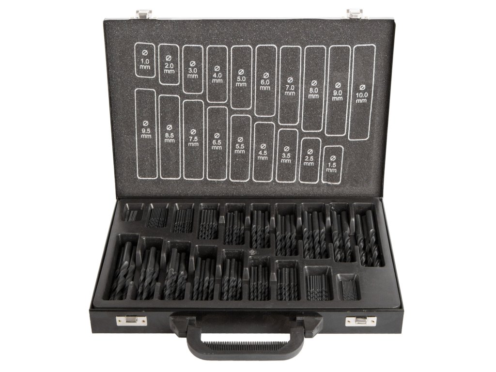 Kvalitní standardní vrtáky v sadě 170 ks odstupňovaných po 0,5 mm uložené v kovovém boxu.