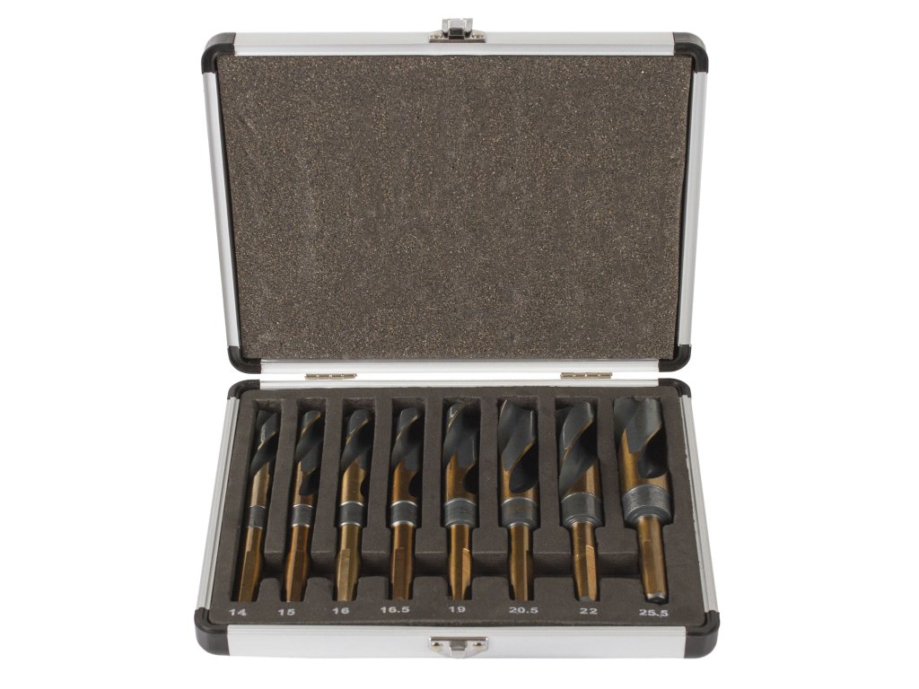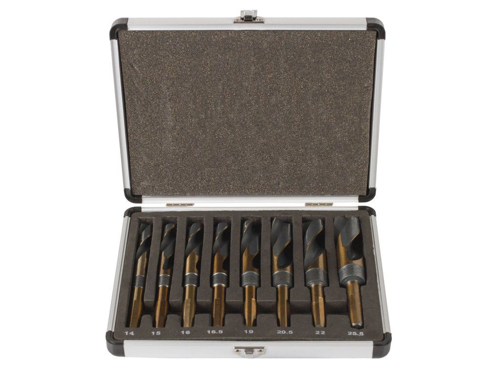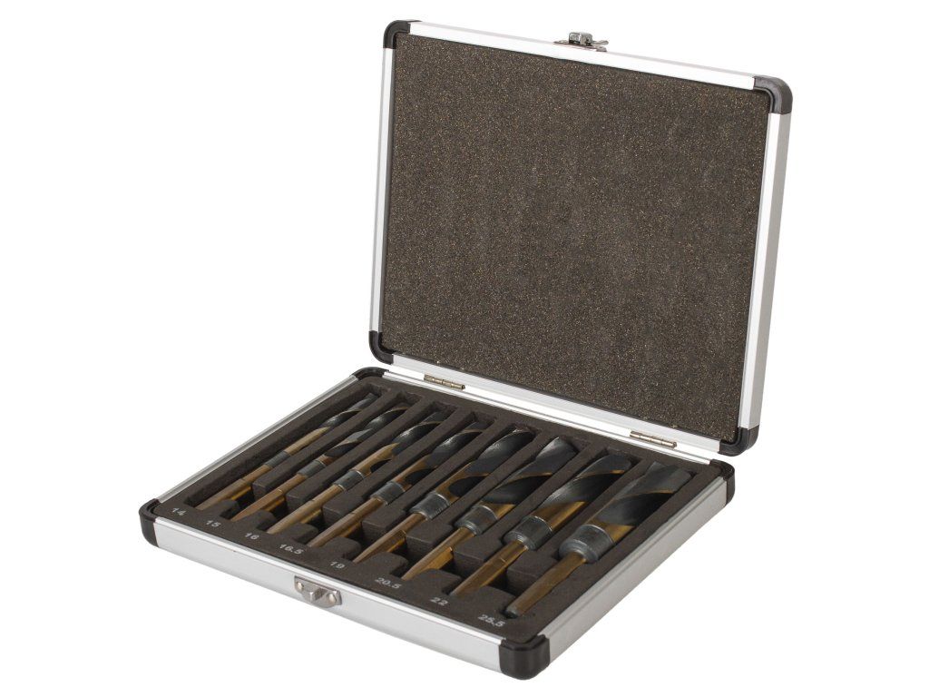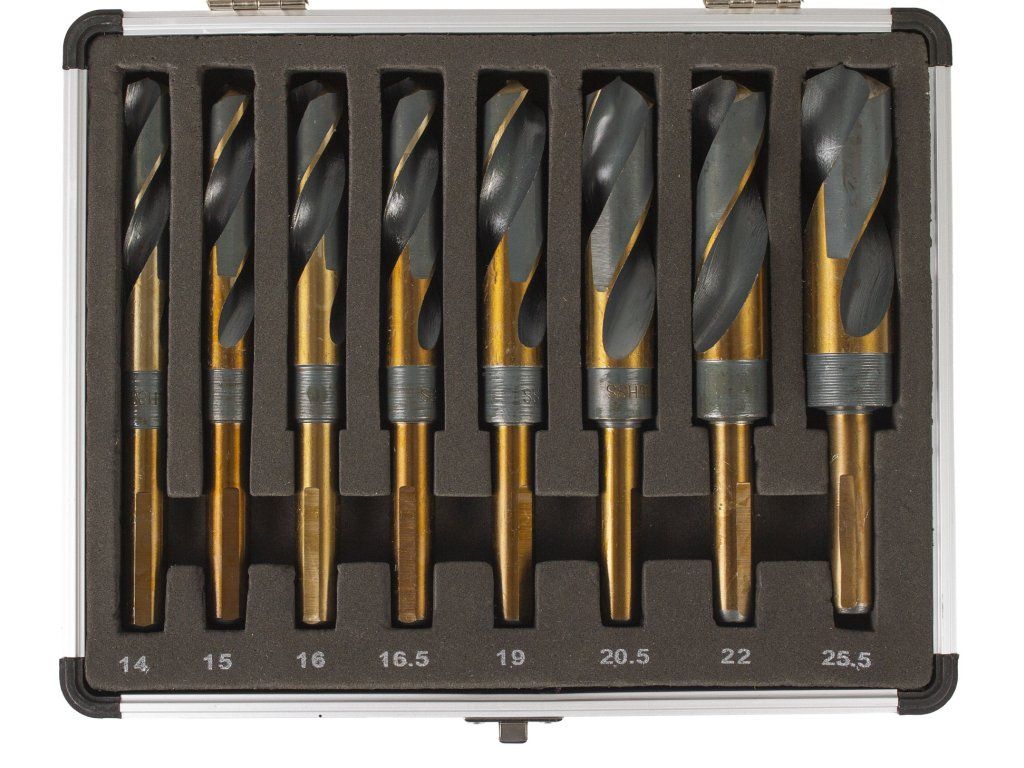 Sada vrtáků HSS do kovu i dřeva s upnutím 1/2". Vrtáky o rozměrech 14, 15, 16, 16.5, 19, 20.5, 22 a 25.5 mm.