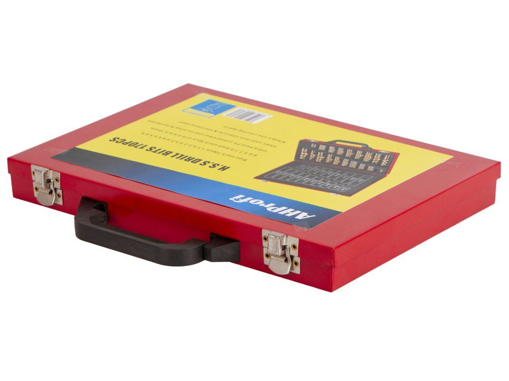 - Sada 170 vrtáků s titanovou povrchovou úpravou (dle normy DIN 338) a válcovou stopkou.