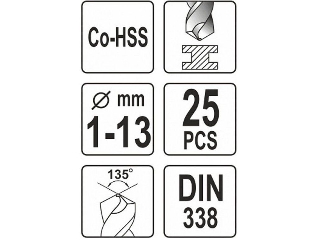 Sada spirálových vrtáků z legované rychlořezné oceli podle normy DIN 338. Vrtáky obsahují 5% cobaltu a jsou odolné vůči vysokým teplotám.