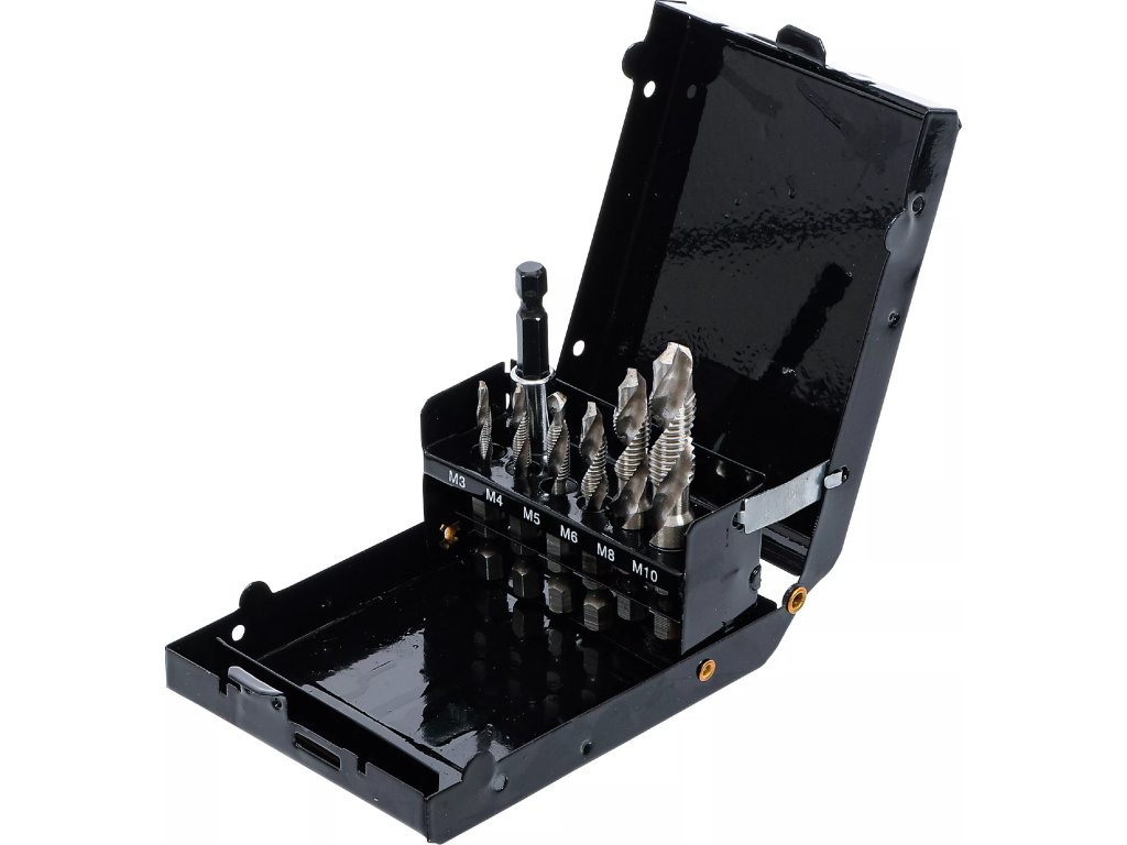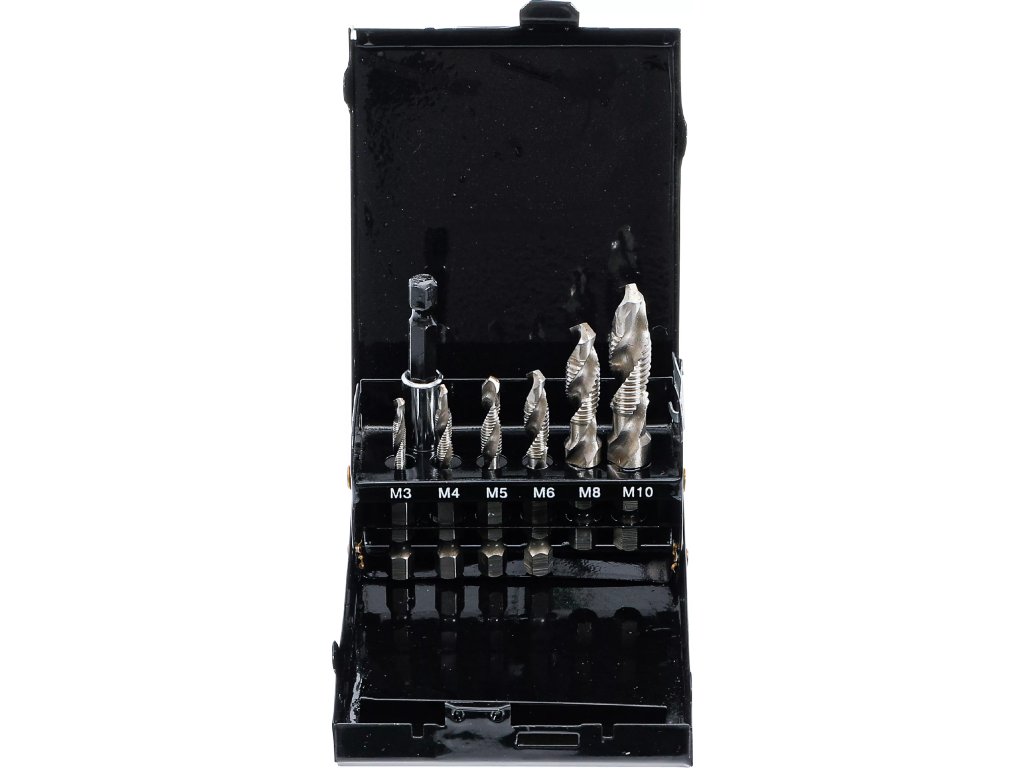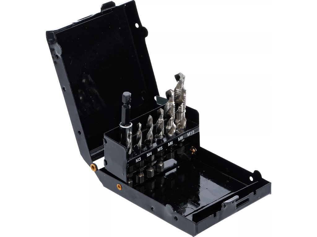 Sada kombinovaných závitníků s vrtákem k vrtání otvorů a vyřezávání závitu zároveň.