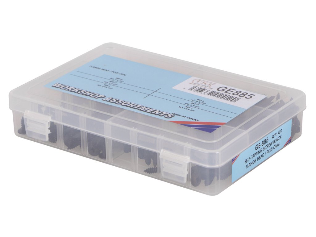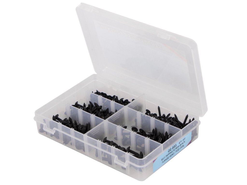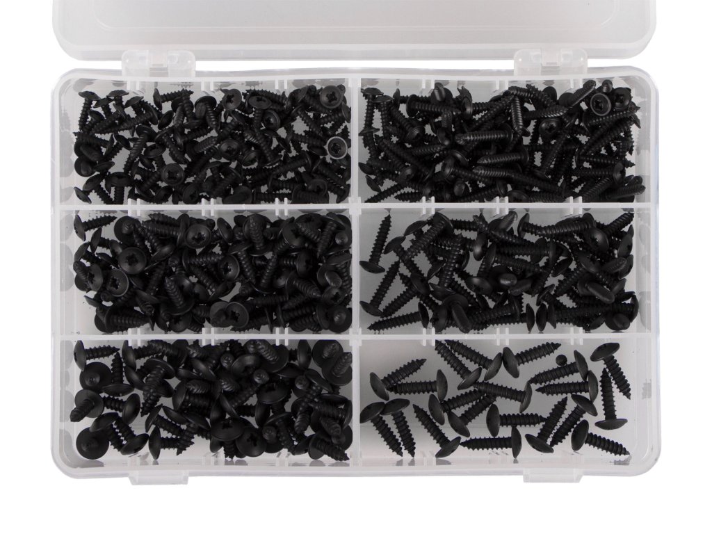 Sada 420 ks vrutů o rozměrech: 6 x 1/2", 6 x 3/4", 8 x 1/2", 8 x 3/4", 10 x 1/2" a 10 x 3/4".