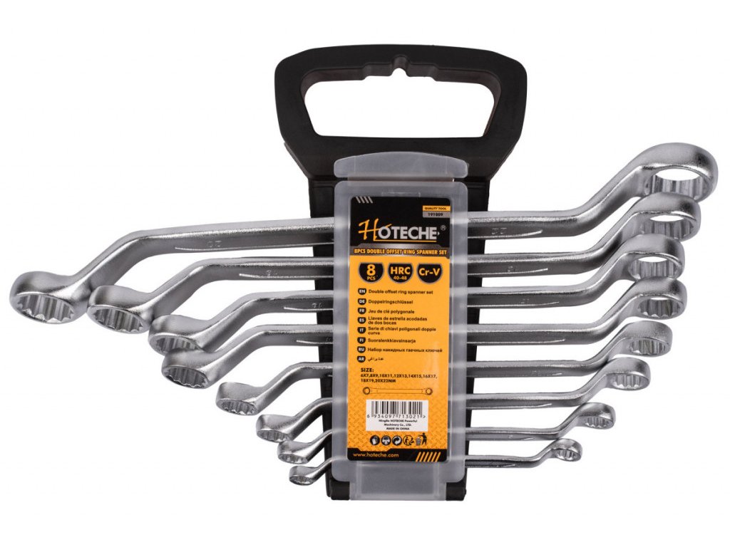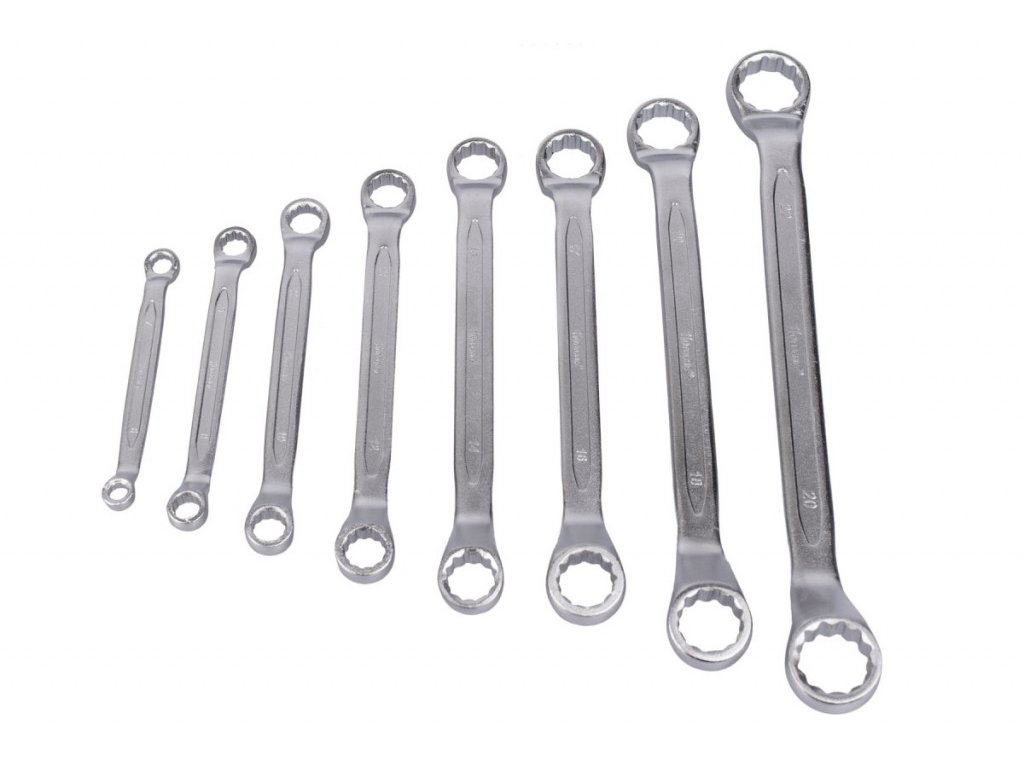 Očkoploché vyhnuté klíče v sadě 8 ks, která je přehledně uložena v plastovém držáku. Díky držáku je pak sada úspornější na skladovací prostor a za pomoci plastového oka se snadno přenáší. Klíče jsou vyrobeny z kvalitní chrom-vanadiové oceli.