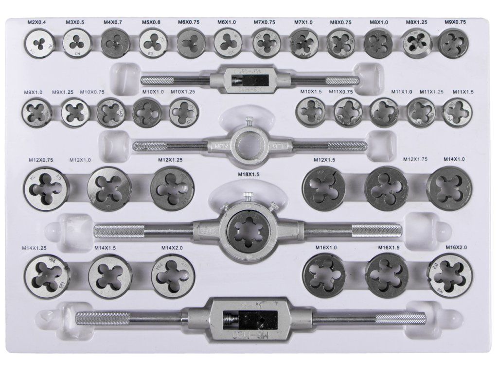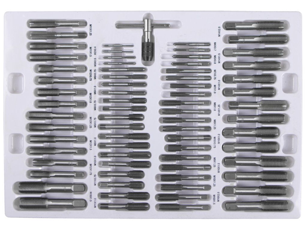 - Sada 110 ks metrických závitníků a závitových oček z nástrojové oceli pro ruční závitování pomocí vratidla.