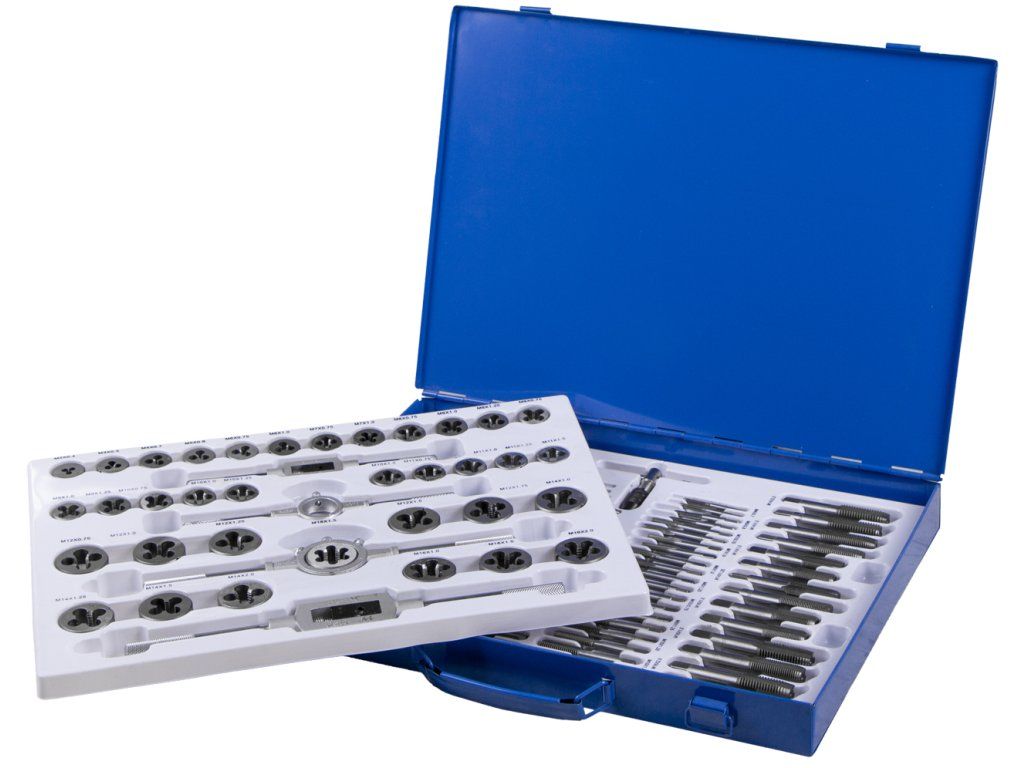 Sada 110 ks metrických závitníků a závitových oček z nástrojové oceli pro ruční závitování pomocí vratidla.