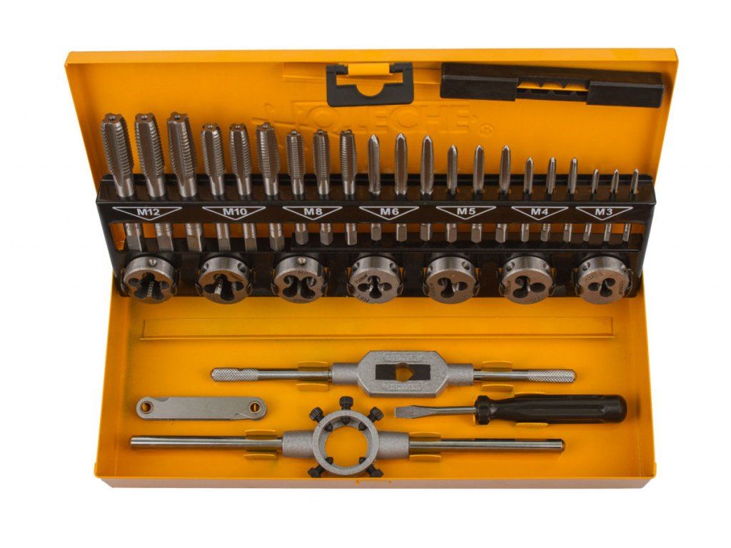 Sada kvalitních závitníků a oček vyrobených z rychlořezné oceli HSS vyrobené značkou Hoteche.