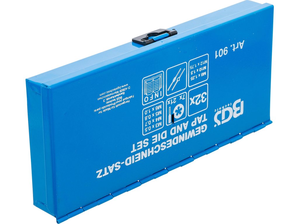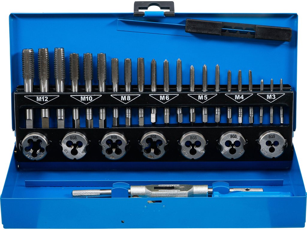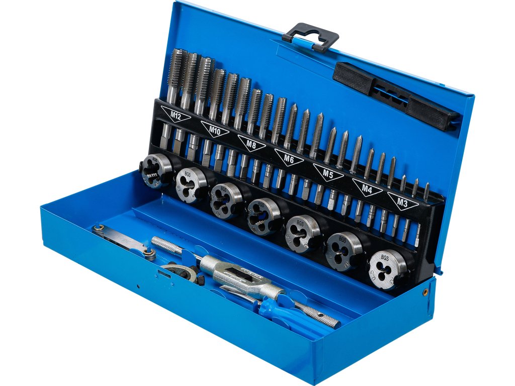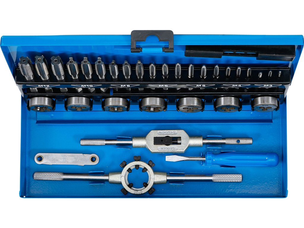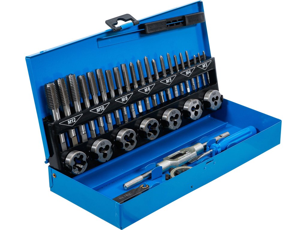 32 ks v sadě, M3 - M12, plechový box, obsahuje očka, závitníky, vratidlo pro očka a závitníky, řezací nůž, šroubovák.