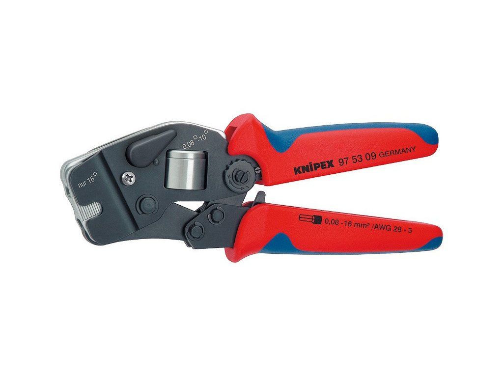 K lisování dutinek podle DIN 46228 část 1 + 4. Automatické přizpůsobení požadované velikosti koncových dutinek: nehrozí chyba při krimpování kvůli použití nesprávné dutinky. čelní zavádění dutinek do nástroje. Konstantně vysoká kvalita lisování díky nucenému blokování (možné odblokovat). Krimpovací tlak je z výroby přesně nastaven (kalibrován), nastavení lze upravit. Zvětšení síly díky lomené páce pro snížení únavy při práci. Vysoký komfort při obsluze díky tvaru dobře padnoucímu do ruky a nepatrné hmotnosti. Chromvanadová elektroocel ve zvláštní jakosti, kalená v oleji. Lisování od 08 - 10 mm? a 16 mm? v jednom profilu. S pákou pro volbu nastavení rozsahu lisování 08 - 10 nebo 16 mm?. Velmi vhodné pro všechny koncové dutinky Twin do 2 x 6 mm? nebo 2 x AWG 8.