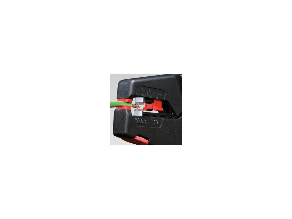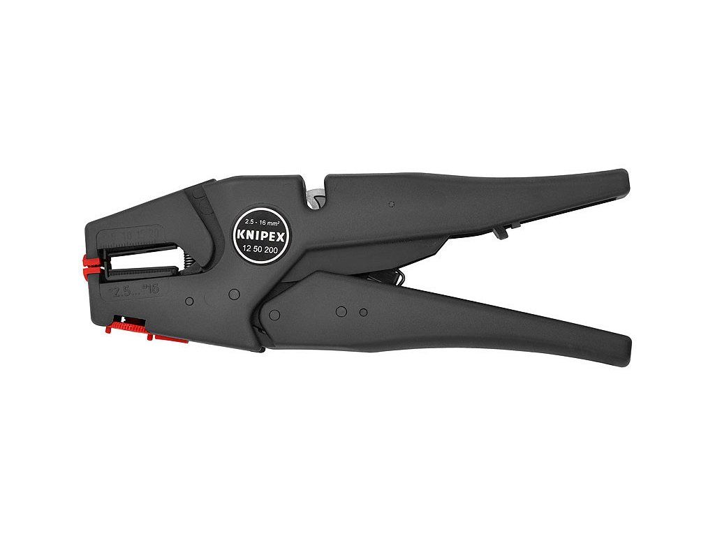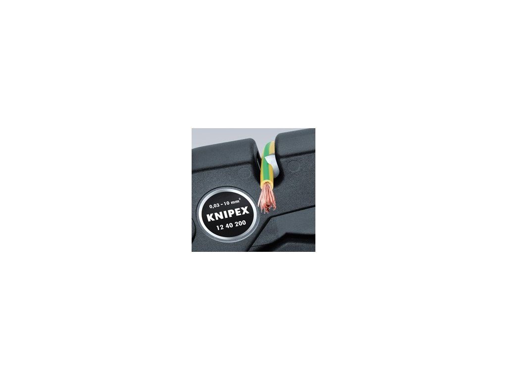 Pro jednožilové vodiče, vícežilové vodiče, vodiče s jemnými dráty s umělohmotnou nebo gumovou izolací. Automaticky se přizpůsobuje různým průřezům vodičů - tím nedochází k žádnému poškozování vodičů. Hloubka řezu nastavitelná pro různé izolační materiály. S kleštěmi na štípání měděných a hliníkových vodičů s více dráty do 10 mm? nebo jedním drátem do 6 mm?. Mechanika s lehkým chodem. Nože a plastové upínací čelisti lehce vyměnitelné. Nepatrná hmotnost. Těleso: plast, vyztužen optickými vlákny. Nůž: speciální nástrojová ocel, kalená v oleji.