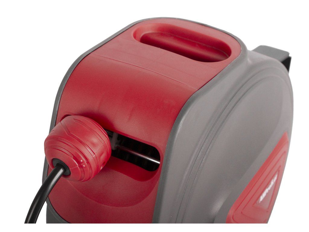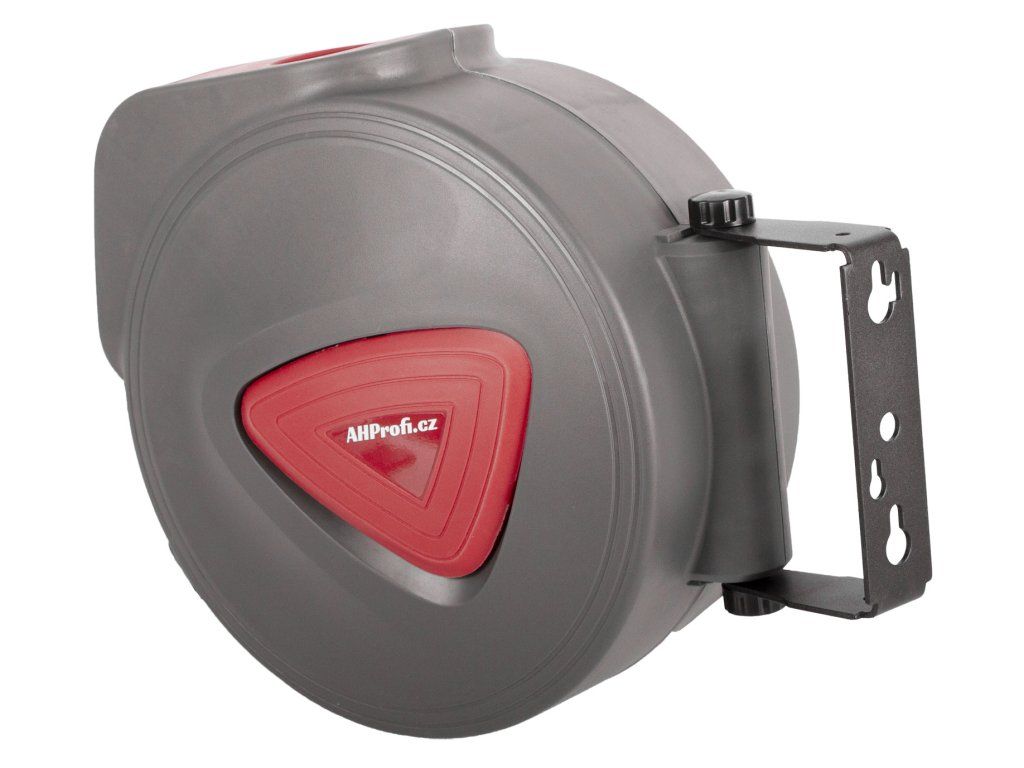 Kvalitní samonavíjecí prodlužovací kabel 12m, vhodný do dílny, garáže i na zahradu, otočný držák pro připevnění na stěnu či strop.