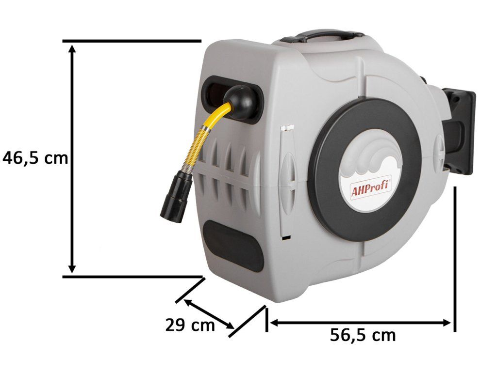 Samonavíjecí buben s 20 metrovou PVC hadicí na stlačený vzduch, pracovní tlak 6 bar, 2 metry dlouhá hadice ke zdroji.