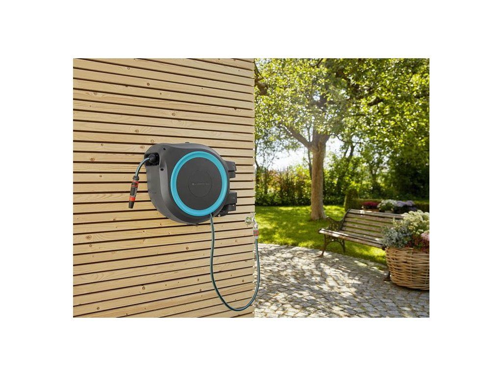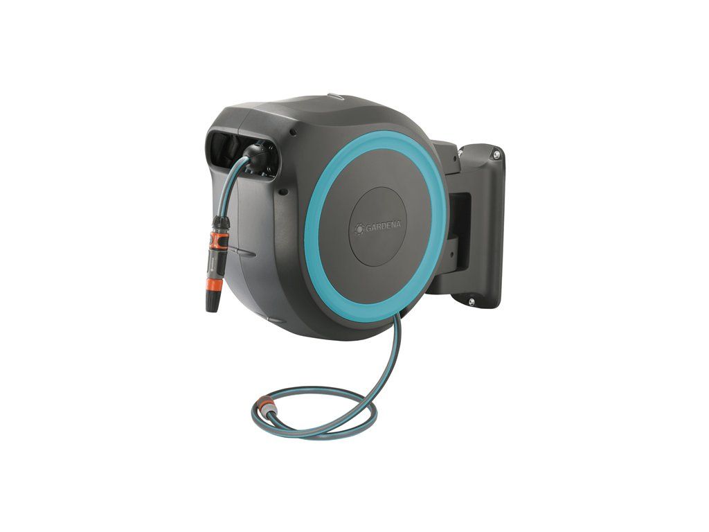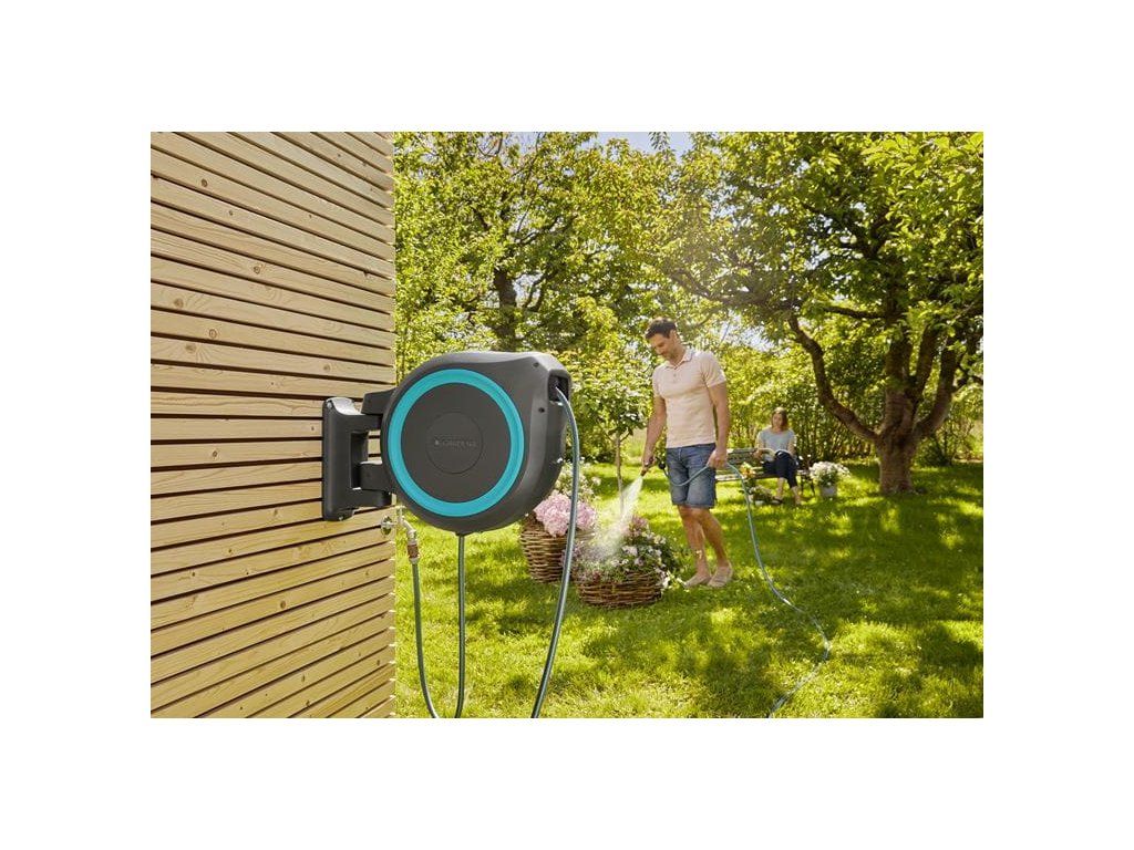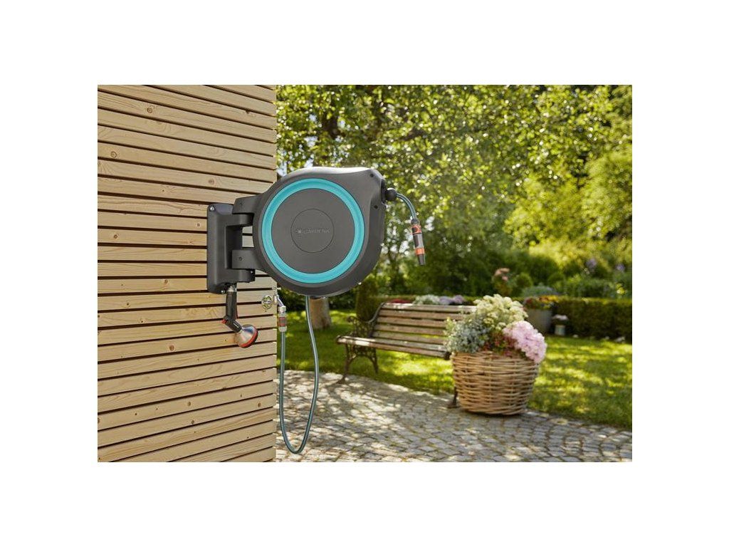 Robustní nástěnný držák umožňuje otáčet boxem na hadici o více než 180°, abyste se bez námahy dostali do všech koutů zahrady. Pro přímé použití jednoduše vytáhnete zahradní hadici na maximální délku 35 metrů. Zahradní hadice se po vytažení automaticky uzamyká po velmi krátkých vzdálenostech, a to znamená, že se s hadicí velmi snadno manipuluje.
