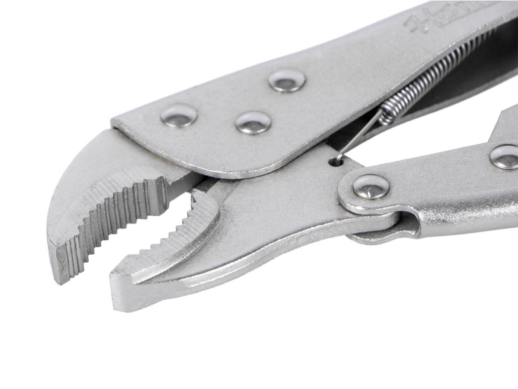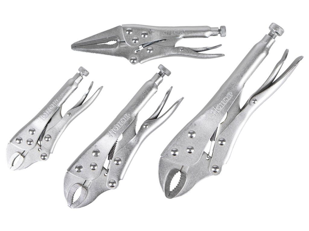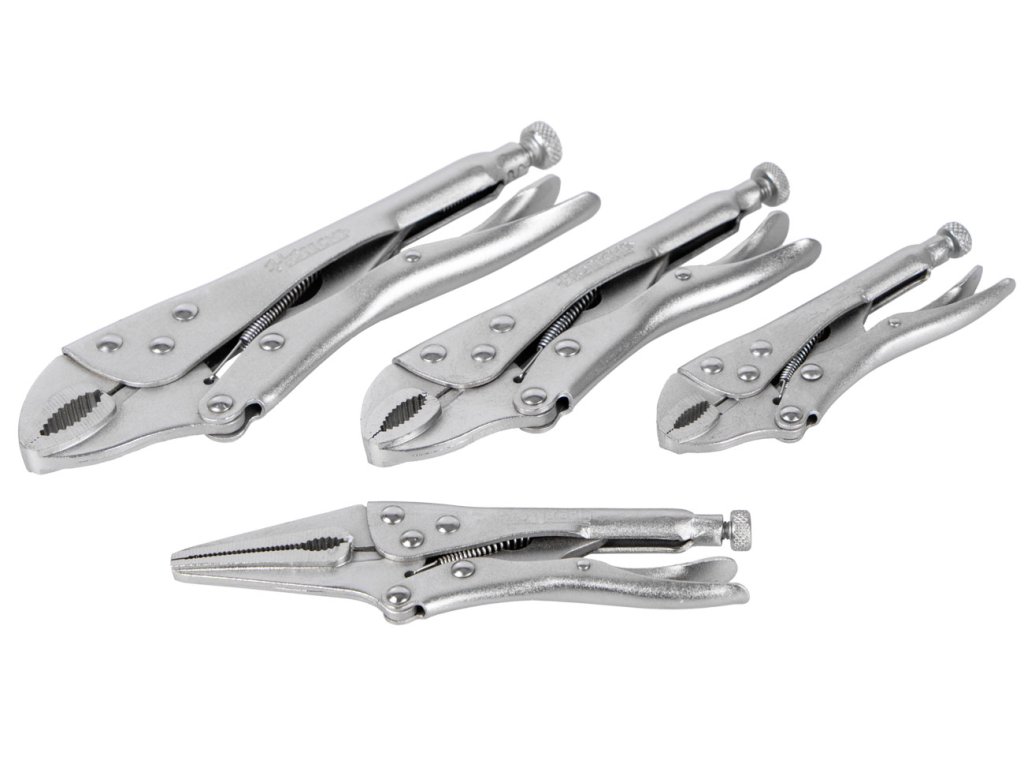 Rychloupínací kleště, sada 4 ks. 1× kleště s kulatými čelistmi 5", 1× kleště s dlouhými čelistmi 6.5", 1× kulaté čelisti 7", 1× zakřivené čelisti 10". Uhlíková ocel, niklovaná.